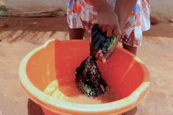 副収入を得るため、村の女性たちに代わり洗濯をするシャミンさん。 |