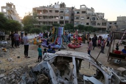 2017年6月、人道支援の届かない包囲の中でも、東ゴータに住む子どもたちは、ラマダン(断食)明けを祝うイスラム教の祝日、Eid al-Fitrを祝って遊んでいます。