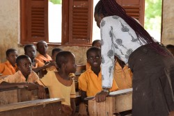 ガーナのアッパー・イースト州北部、サンデマ地域にある小学校。今日の算数の授業は、割り算についてです。パトリシア・アデボリンサちゃんも、先生の話に耳を傾けます。