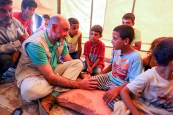 アリーシャ避難民キャンプで子どもたちに会うユニセフ(国連児童基金)・シリア事務所代表のフラン・エクイザ。 |