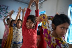 ユニセフの教育センターで蝶のポーズをするロヒンギャ難民の女の子たち。(2017年6月撮影) |