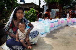 バングラデシュでは、ユニセフは政府と協力し、洪水の影響を受けている約150万人に対して、井戸4万基を建設、修復および消毒し、浄水剤100万錠、衛生キット837セット、給水タンク6,400個、および漂白剤5,080キロを提供しました。ユニセフは、地域の教育当局と協力して、水位が下がったら直ちにまずは6,000人の子どもたちが守られた環境の下学習できるよう緊急の教育サービスを準備しています。ユニセフは、仮設の学習スペースおよび暫定的な学校を設置し、800人の子どもに対する緊急時の教育キットの提供を進めており、子どもと教員が通学時に使用するボートを手配しています。