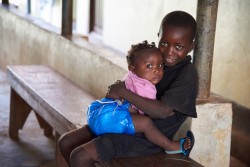 妹を抱きしめる男の子。(2017年6月3日撮影) |