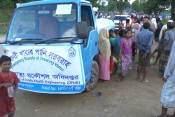 給水車から水を汲むロヒンギャ難民の人たち。 |