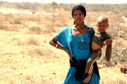 干ばつに襲われた村を、子どもを抱いて歩く母親。(2017年3月撮影) |