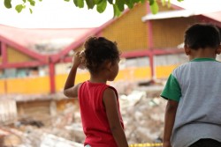 崩れた校舎を眺める子どもたち(オアハカ州)。(2017年9月10日撮影) |