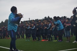 流通経済大学フットボールフィールド(茨城)で行われた関東大学サッカーリーグの流通経済大学vs駒澤大学の試合会場では、全日本大学サッカー連盟(JUFA)の学生幹事のみなさんによる手洗いイベントが行われました。当日参加したエスコートキッズの子どもたちは、クイズなどで手洗いの大切さを知り、世界手洗いダンスで正しい手の洗い方を楽しく覚えました。その成果は、ハーフタイムで。両大学の選手も一緒にピッチに出て、観客たちに披露しました。あいにくの雨の中でしたが、応援席も巻き込んで元気いっぱい踊り、会場は一体になって盛り上がりました。