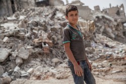 破壊された建物の前に立つ男の子。(アレッポ郊外)2017年5月撮影 |