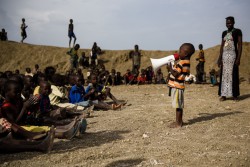 文民保護区で開かれたイベントで、前に立って話す男の子。(ベンティウ・南スーダン)2017年4月撮影 |