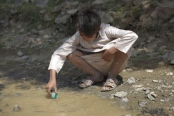 下水管から流れた水で遊ぶ子ども。(2017年10月24日撮影) |
