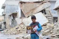 ユニセフが配布した地雷教育用のマニュアルを手にする子ども。(シリア)2017年1月撮影 |