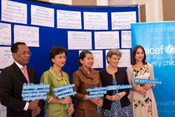 マエン・サムオーン副首相(中央)、 子どもへの暴力に関する国連事務総長特別代表 マルタ・サントス・ パイス(右から二番目)、 ユニセフ・カンボジア事務所のデボラ・コミニ代表(一番右) |