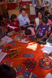 ユニセフ事務局次長ジャスティン・ フォーサイスに絵を見せる子どもたち。(2018年1月24日撮影) |