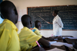 ユニセフが支援する学校で、英語の授業を受ける子どもたち。(南スーダン)2017年3月撮影 |