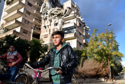 ホムス旧市街の、破壊されたアパートの前で遊ぶ子どもたち。(2017年11月22日撮影) |