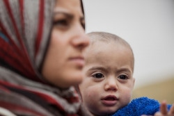 仮設の保健センターで検診を受けた1歳のフセイン君。(2017年12月19日撮影) |