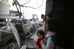 人道支援物資を載せたトラックを眺める子どもたち。(2018年3月5日撮影) |