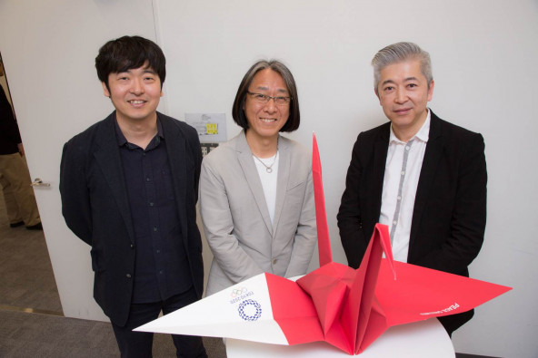 (左から) 京都造形芸術大学の並河進さん、福島デザインの福島治さん、HAKUHODO DESIGNの永井一史さん。ユニセフ「祈りのツリー」プロジェクトに続き、今回もクリエイティブ・ボランティアとしてPEACE ORIZURUを支えてくださっています。 |