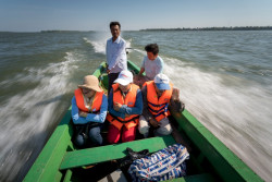 遠く離れたコミュニティにワクチンを届けるため、メコン川をボートに乗って進むバナックさんと保健チーム。 |