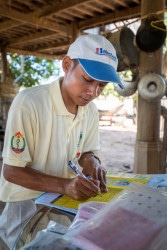 コーサム村で、診療記録を書くバナックさん。 |