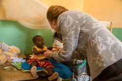 保健センターで赤ちゃんの手を握るヘンリエッタ・フォア事務局長。(2018年5月28日撮影) |