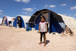 難民キャンプの仮設テントの前に立つ女の子。(2018年5月17日撮影) |