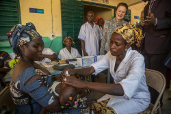マリの保健センターで、予防接種の様子を見守るヘンリエッタ・フォア事務局長。(2018年5月28日撮影) |