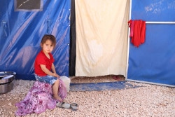 シリアの難民キャンプで、仮設テントの前に座る女の子。(2018年5月17日撮影) |