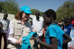 南スーダンのユニティ州で、ユニセフが支援する学校に通う子どもと交流する、ユニセフ事務局長のヘンリエッタ・フォア。(2018年1月18日撮影) |
