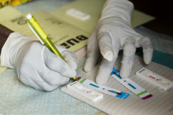 採取した血液で、HIV検査とマラリア検査がおこなわれている(ウガンダ) |