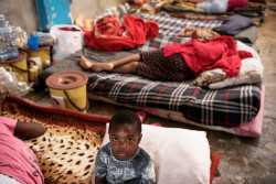 リビアの拘留施設で、床に敷いたマットレスの上に座る子ども。(2017年7月撮影) |