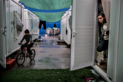 ギリシャの難民キャンプで、家から顔をのぞかせるシリア難民で18歳のアズハル・カリルさん。(2017年3月撮影) |