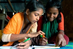 ロヒンギャ難民のラジマさん(右・10歳)に勉強を教えるバングラデシュ人のタスミンさん(左・10歳)。(2018年8月5日撮影) |