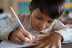 カンボジアの小学校で、授業の内容をノートに書き込む男の子。 (2018年7月5日撮影) |