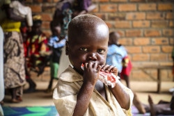 RUTF(すぐに口にできる栄養治療食)を口にする子ども。(2018年8月撮影) |