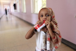 子どもたちを取り巻く急性栄養不良の程度は重いままです。イエメンでは、180万人の子どもが急性の栄養不良で、それには最も深刻な状態にある約40万人の子どもが含まれます。重度の急性栄養不良の子どもは、もし治療が間に合わなければ、同年齢の健康な子どもに比べ、死のリスクが11倍高まります。重度の栄養不良を悪化させているのは、食料の不足、家庭における不十分な子どもの食事、最善には及ばない保健、水と衛生システム、病気の流行や経済の崩壊等の複合的な要因です。