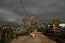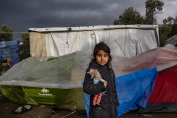 ギリシャのレスボス島モリアにある難民・移民受入・身元確認センターで、滞在するテントの前に立つ女の子。(2018年12月撮影) |