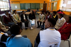 南アフリカの高校で、学校における暴力について話し合う生徒たち。 (2018年7月撮影) |