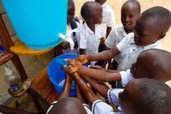 コンゴ民主共和国・ベニの学校で、エボラ出血熱から自分を守る方法を学び、手洗いをする子どもたち。(2018年9月撮影) |