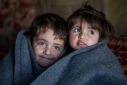 イラク北部の難民キャンプで、毛布にくるまる子どもたち。 |