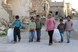 冬服の支援物資を受け取り、家に帰る途中の子どもたち。(2019年1月22日撮影) |
