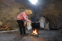 アレッポ東部の自宅で、料理をするために火をつける12歳のガーダさん。冬服が足りず、体調を崩すことも多い。(2019年1月22日撮影) |