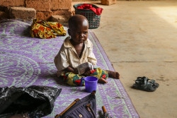 バンギ郊外の村の保健センターで、栄養不良の治療を待つ3歳の男の子。(2018年8月撮影) |