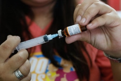 フィリピンの保健センターで、予防接種の準備をする保健員。 |