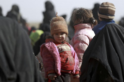 デリゾール郊外の町や村から逃れ、これから約300km離れたアルホル(Al Hol)難民キャンプに避難する人たち。(2019年1月26日撮影) |
