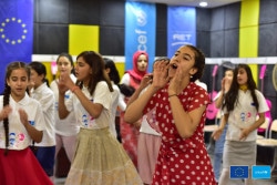 「シリア危機に対応するためのEU 地域信託基金(Madad 基金)」の支援の下、ユニセフとジアド・ラバーニ氏は、障がいをもつ子どもを含む約300人の子どもたちと計11回のワークショップで歌の練習をし、新しくアレンジした歌をレコーディングしました。そのワークショップには、ヨルダン、イラク、レバノン、パレスチナ、トルコの子どもたちも参加しました。