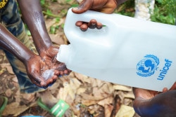 石けんときれいな水を使って手洗いをする子ども。ユニセフは、感染症予防になる手洗いの習慣を広めるための啓発活動もしている。(ウガンダ) |