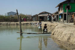池の水を汲む、幼い女の子たち。ラカイン州中部にあるこのキャンプでは、4000人のロヒンギャの人々が暮らしている(ミャンマー) |