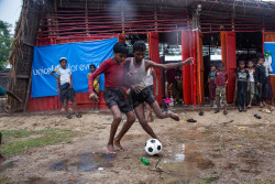 バングラデシュ・ロヒンギャ難民キャンプ内のユニセフが支援する子どもにやさしい空間で、サッカーボールを追いかけ遊ぶ子どもたち。 |