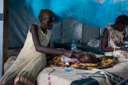 南スーダンのジュバにある病院で、ペットボトルの水を妹に飲ませる姉。 |